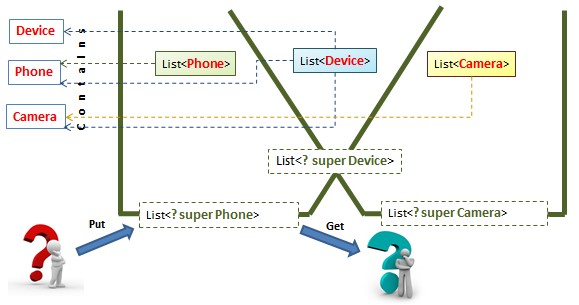 List<Device> devices = new ArrayList<>(); devices.add(new Camera()); // devices list that contains Camera object List<? super Phone> phonesWildcard; phonesWildcard = devices; Phone phone = phonesWildcard.get(0); // Compilation error! Incompatible types.